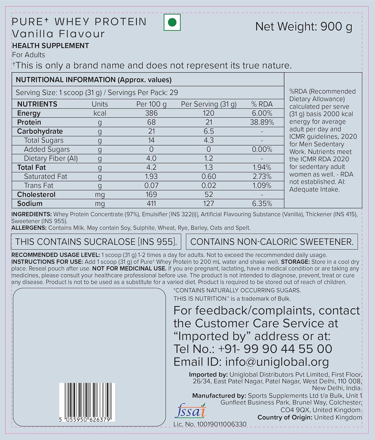 Bulk Pure Whey Protein is a high-quality whey protein isolate designed to support muscle growth, muscle repair, and recovery. It delivers 21g of premium protein per serving, providing all the essential amino acids for effective muscle maintenance. The inclusion of 5g of naturally occurring BCAAs (Branched-Chain Amino Acids) is crucial for reducing muscle breakdown and accelerating recovery after intense workouts. Whey protein isolate is fast-digesting, making it an ideal choice for post-workout nutrition.This whay protein powder is low in sugar and carbohydrates, making it perfect for those on a low-carb or calorie-conscious diet. Whether you're looking to gain muscle, lose fat, or maintain your current fitness, Bulk Pure Whey Protein fits seamlessly into your daily routine. It mixes smoothly with water or milk, offering a convenient and enjoyable way to boost your daily isolated whey protein powder intake.Best for protein powder for men Ideal for athletes, bodybuilders, and fitness enthusiasts, this whey protein isolate helps with muscle recovery and supports muscle-building goals. It is versatile enough to be added to smoothies, baked goods, or enjoyed as a shake. Enhance your muscle gain and fat loss journey with the clean, effective protein boost from Bulk Pure Whey Protein.