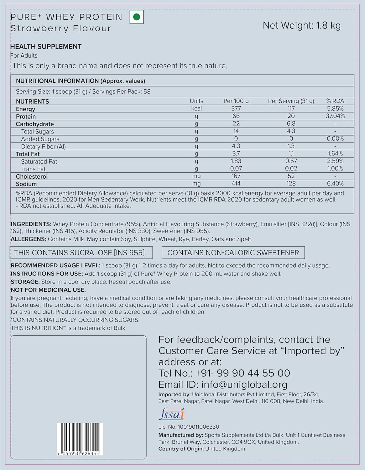 Bulk Pure Whey Protein is a high-quality whey protein isolate designed to support muscle growth, muscle repair, and recovery. It delivers 21g of premium protein per serving, providing all the essential amino acids for effective muscle maintenance. The inclusion of 5g of naturally occurring BCAAs (Branched-Chain Amino Acids) is crucial for reducing muscle breakdown and accelerating recovery after intense workouts. Whey protein isolate is a fast-digesting protein, making it an ideal choice for post-workout nutrition.This way protein powder is low in sugar and carbohydrates, making it perfect for those on a low-carb or calorie-conscious diet. Whether you're looking to gain muscle, lose fat, or maintain your current fitness, Bulk Pure Whey Protein fits seamlessly into your daily routine. It mixes smoothly with water or milk, offering a convenient and enjoyable way to boost your daily isolated whey protein powder intake. Best for protein powder for men Ideal for athletes, bodybuilders, and fitness enthusiasts, this whey protein isolate helps with muscle recovery and supports muscle-building goals. It is versatile enough to be added to smoothies, baked goods, or enjoyed as a shake. Enhance your muscle gain and fat loss journey with the clean, effective protein boost from Bulk Pure Whey Protein.